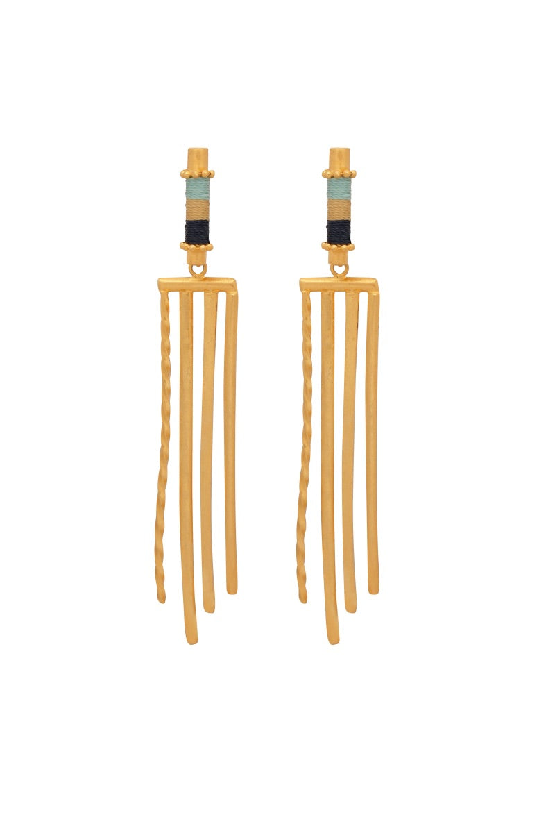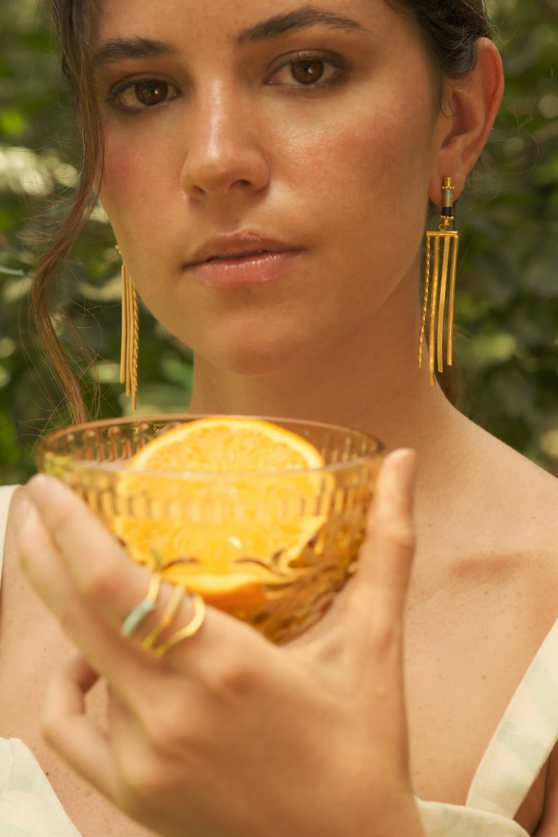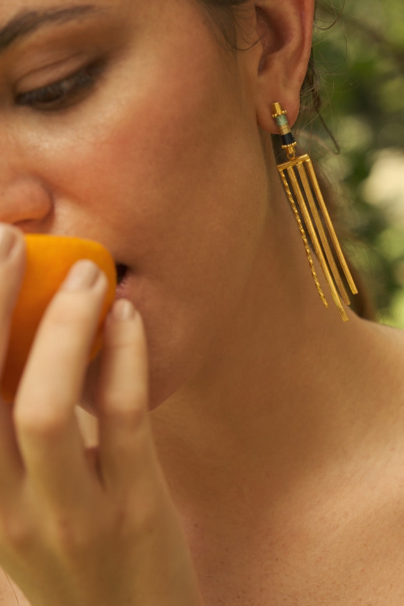 Aretes elaborados en bronce con baño en oro de 24k y tejidos a mano.