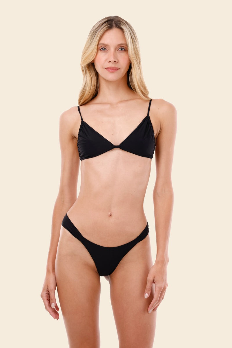 Un top de bikini de silueta clásica en forma de triángulo, con tiras delgadas ajustables que permiten un calce personalizado y cómodo. Su diseño versátil y minimalista lo convierte en un básico atemporal, ideal para combinar con diferentes estilos de bottom.