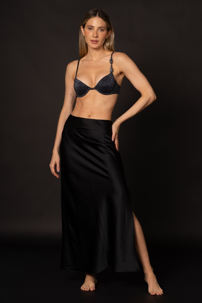 El Top Fer ofrece un ajuste firme gracias a sus copas moldeadas, cargaderas ajustables y broche dorado personalizado en la espalda. Está confeccionado en nuestra tela texturizada negra y completamente forrado. Incluye dos gems aplicadas a mano en las tiras, que le dan un acabado sofisticado. Ideal para quienes buscan soporte con estilo.