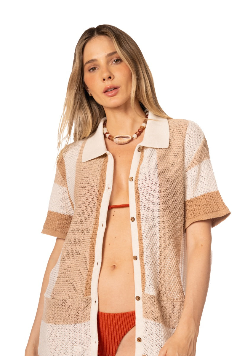 Nuestra camisa tejida de rayas es un complemento perfecto para usar en la playa o en la ciudad. Es cómoda, fresca y ligera. Es elaborada en hilo de algodón reciclado. Cierre frontal con botones. Puedes mezclarla con nuestros pantalones que hacen match para un look total de verano.