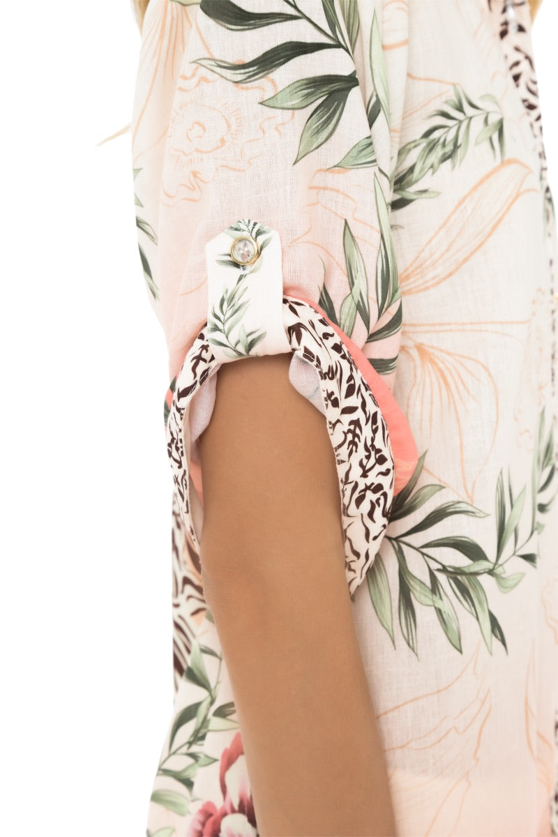 Salida de baño / Camisa, fluida de manga 3/4 en tejido liviano con estampado localizado. Diseñada para llevar abierta sobre el bikini o como sobrecamisa relajada, perfecta para días cálidos con estilo tropical.