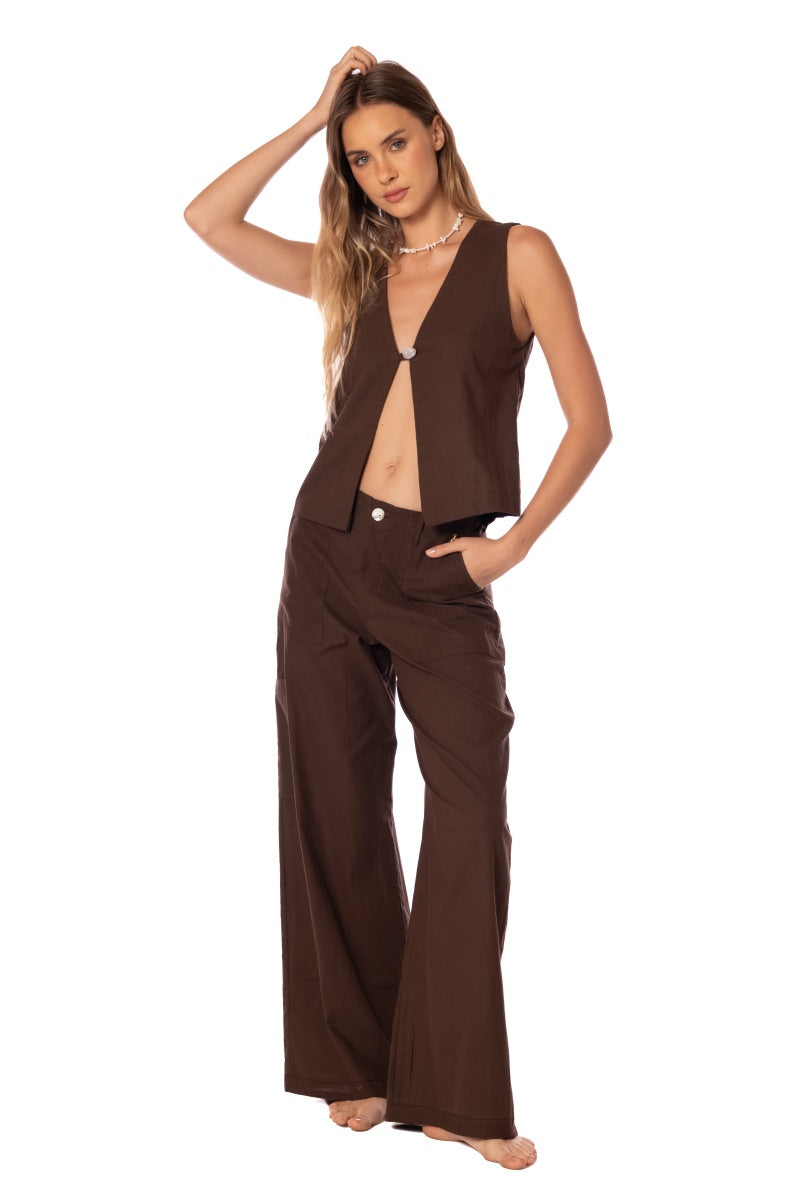Una prenda versátil y llamativa, el chaleco Eternal Sands Eden redefine la elegancia natural. Confeccionado en un intenso tono chocolate, este chaleco sin mangas presenta un profundo escote en V y un exclusivo cierre frontal con un botón de piedra pulida. Su tejido ligero y corte holgado lo hacen perfecto para usar sobre un traje de baño o para un look casual-chic fuera de la playa.