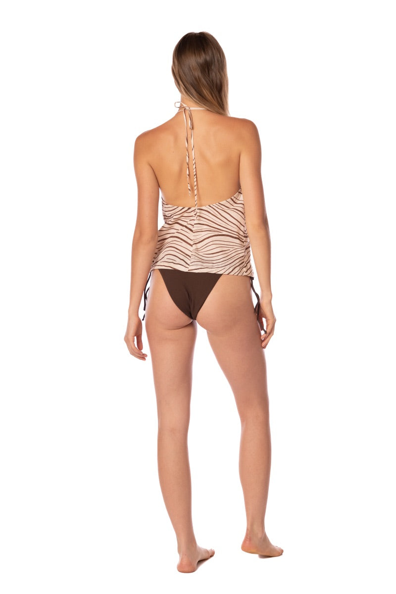 Un top halter ligero y fresco con un toque chic y natural, el Jenny Top con nuestro estampado Eternal Sands es perfecto para días cálidos y reuniones de la hora dorada. Diseñado con un escote en V pronunciado, una abertura central delantera con lazo y una espalda abierta favorecedora con lazos en el cuello halter, combina sensualidad y ligereza. El tejido vaporoso y fluido realza las suaves rayas de inspiración cebra para un look relajado pero sofisticado de transición de playa a ciudad.