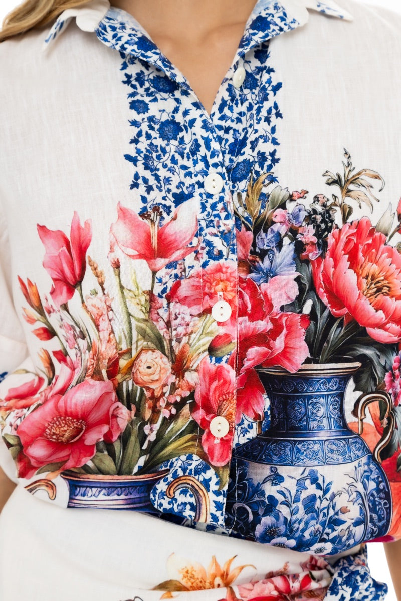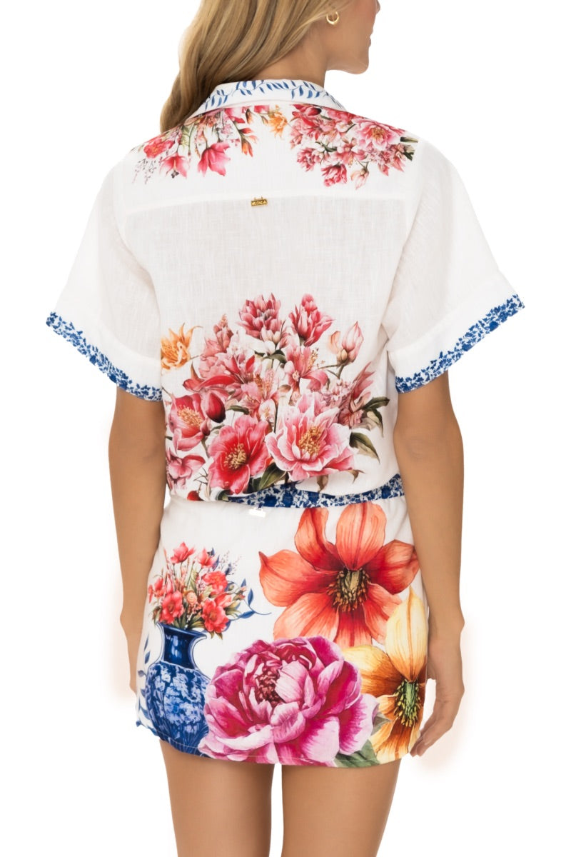 Camisa resort en estampado floral con textura ligera y caída fluida. Confeccionada en 100% poliéster, presenta delicados detalles decorativos que aportan un toque de sofisticación y frescura, ideal para acompañar los looks de playa o resort.