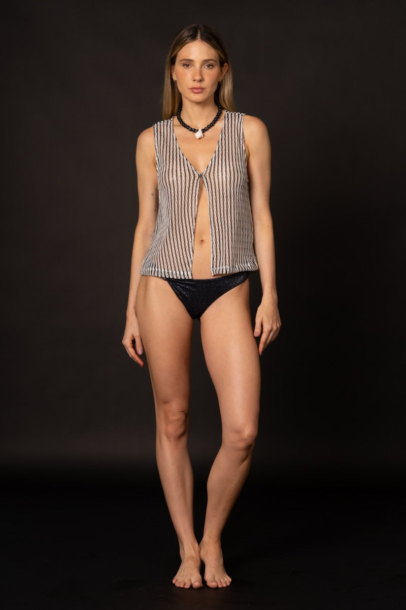 El Chaleco Eden, con escote profundo y broche frontal. Su silueta limpia lo convierte en la prenda ligera ideal para complementar bikinis o pantalones amplios. Confeccionado en una malla tejida especial, aporta dimensión y versatilidad a cualquier look de verano.