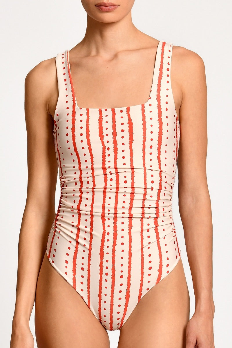 Traje de baño enterizo con drapeado en el la cintura que estiliza la silueta y realza la figura. Su diseño con tirantes anchos brinda soporte y un Fit perfecto para mayor comodidad durante todo el día.