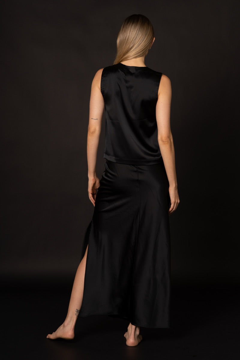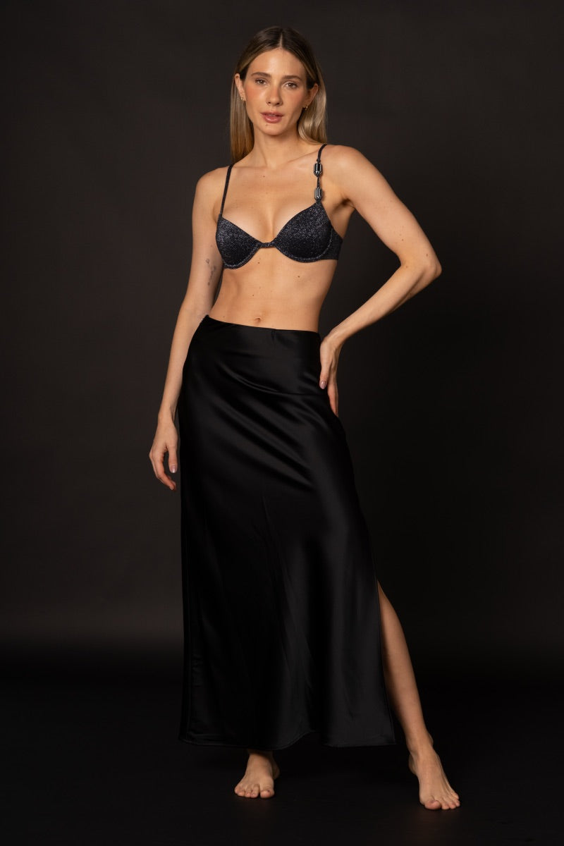 Falda larga en satín negro con cremallera.