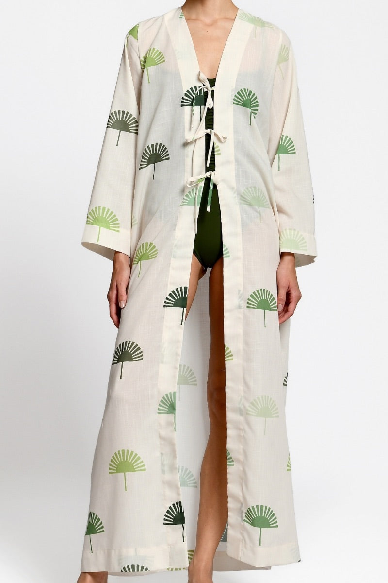 Kimono largo con manga amplia y cierre frontal ajustable con cordón. Su diseño fluido y ligero lo convierte en la prenda ideal para complementar looks de playa, piscina o resort. Perfecto para llevar sobre tu swimwear y lograr un estilo elegante y relajado.