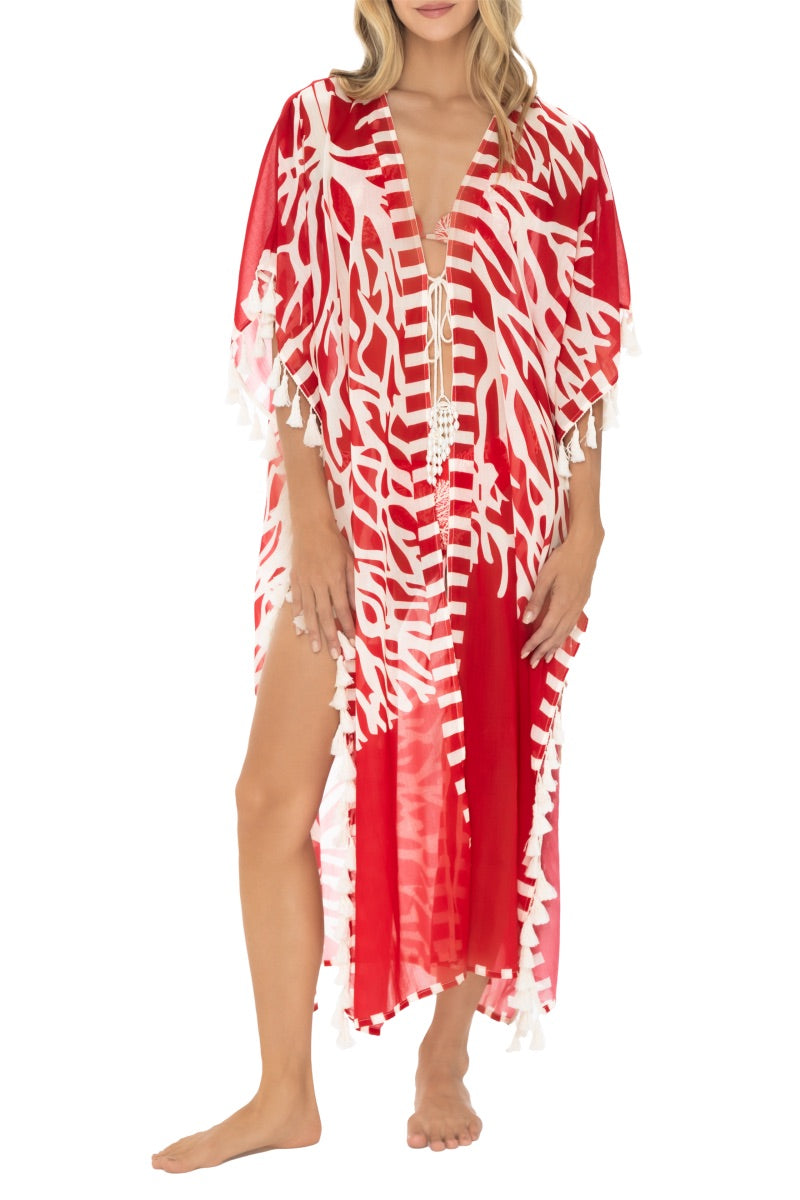 Salida de baño / Kimono, kimono largo de silueta amplia con estampado localizado y caída ligera. Su diseño vaporoso y versátil lo convierte en el complemento perfecto para transformar cualquier look de playa en uno sofisticado y etéreo.