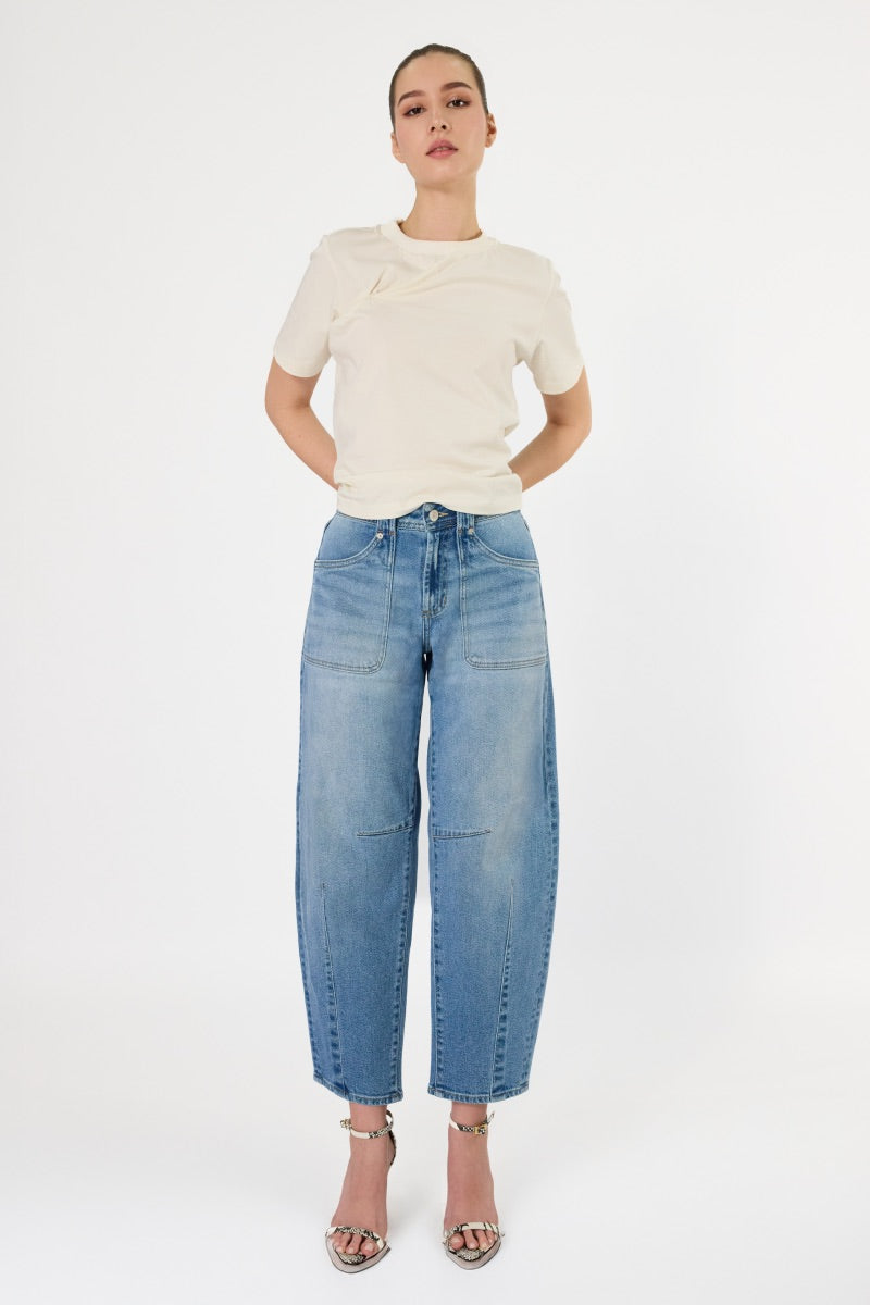 Descripción: Corte holgado en la parte superior y a lo largo de la pierna, con un leve estrechamiento hacia el tobillo que crea una silueta “barril”