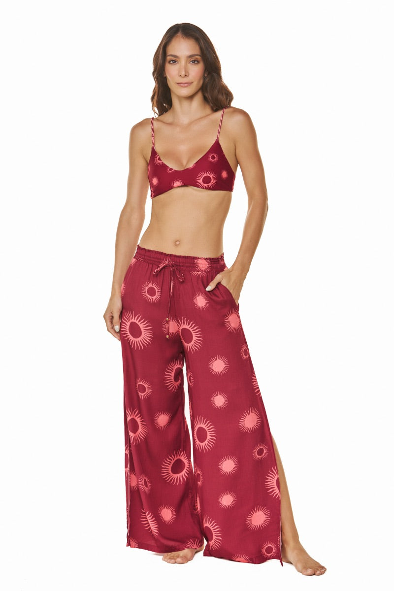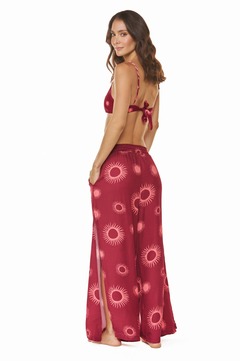 Este pantalón playero largo y ancho en tono vinotinto presenta un estampado elegante de soles y abiertas laterales que aportan frescura. Confeccionado en una tela ligera y fresca, su pretina con elástico suave asegura comodidad sin marcar la figura. Ideal para usarse como salida de playa o para un look exterior sofisticado y relajado.