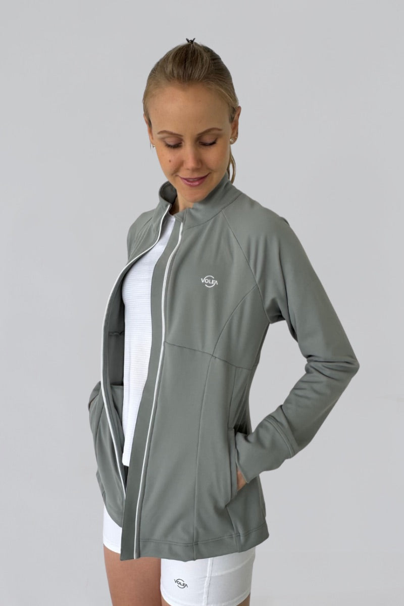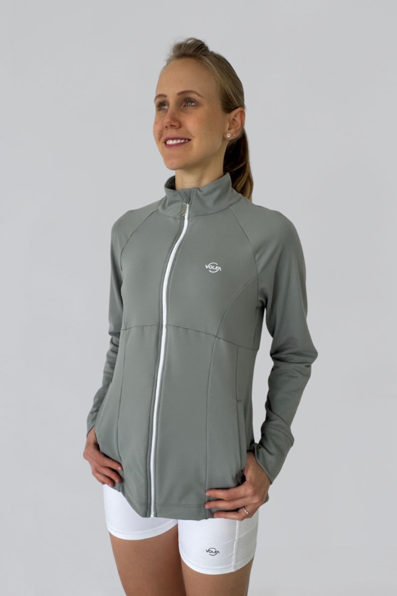 Saco deportivo verde con cuello alto, bolsillos laterales y cierre frontal con puller metálico. Confeccionada en tela suave al tacto y elástica para mayor libertad de movimiento y comodidad. Cortes en la prenda que realzan la figura.