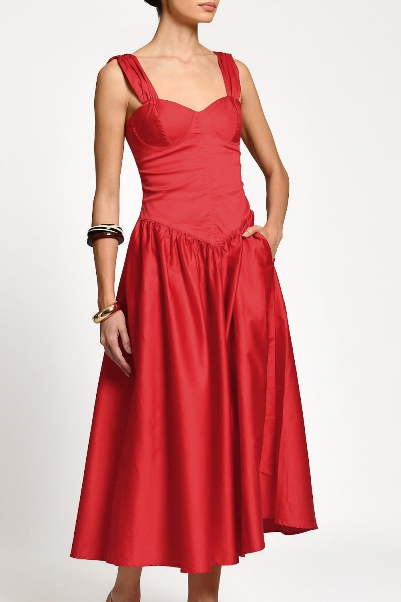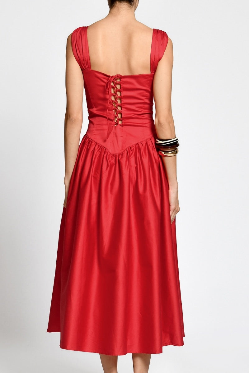 Vestido midi con tirantes gruesos, top estilo corset y lazos ajustables en la parte posterior. Falda ancha y largo medio.