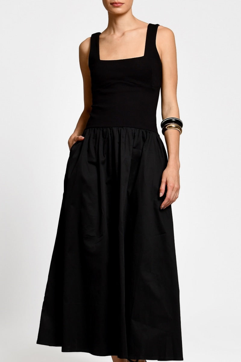 Vestido con escote cuadrado, parte superior es entallada, falda de corte amplio y con vuelo largo midi y bolsillos laterales.