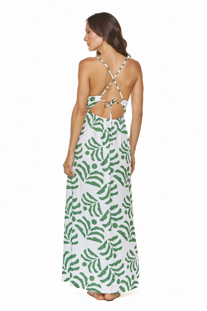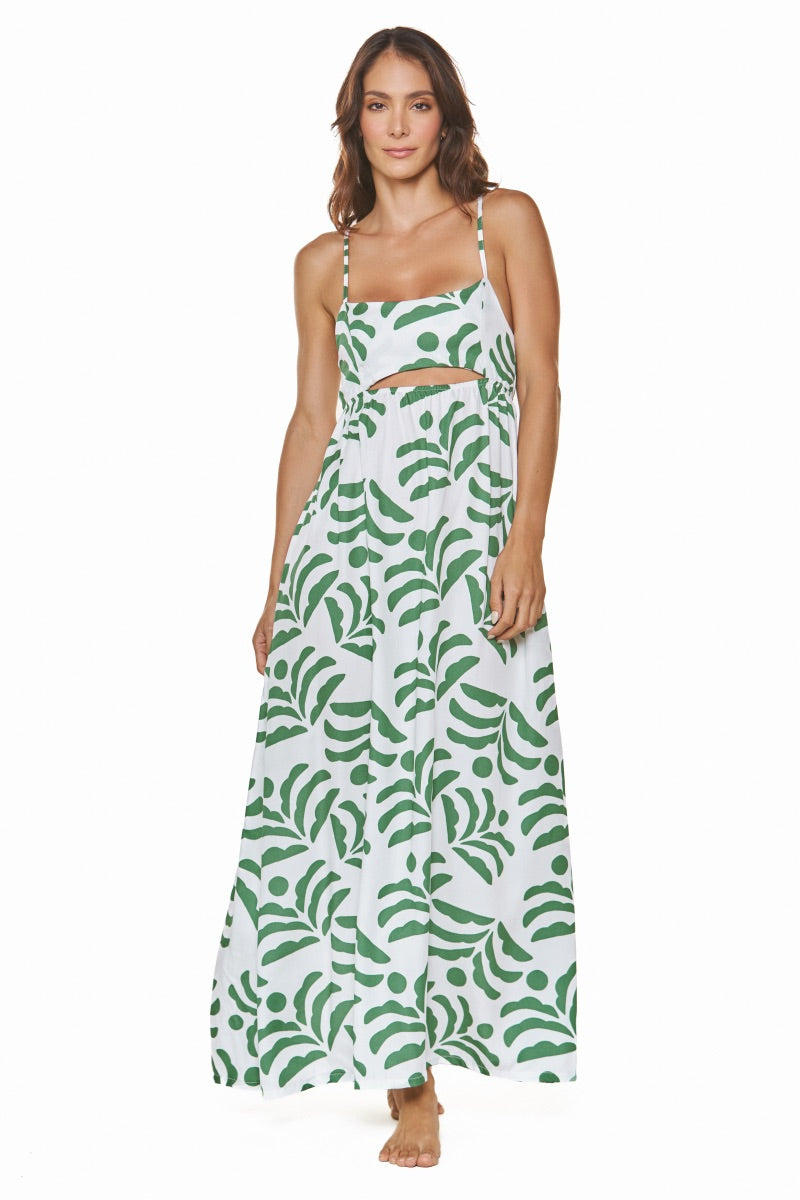 Este vestido largo verde estampado combina elegancia y comodidad con su tela fresca y ligera, perfecta para climas cálidos. Cuenta con una abertura frontal que aporta un toque sofisticado y cargaderas ajustables para un ajuste personalizado. Ideal para usar como salida de playa o como prenda exterior con estilo.
