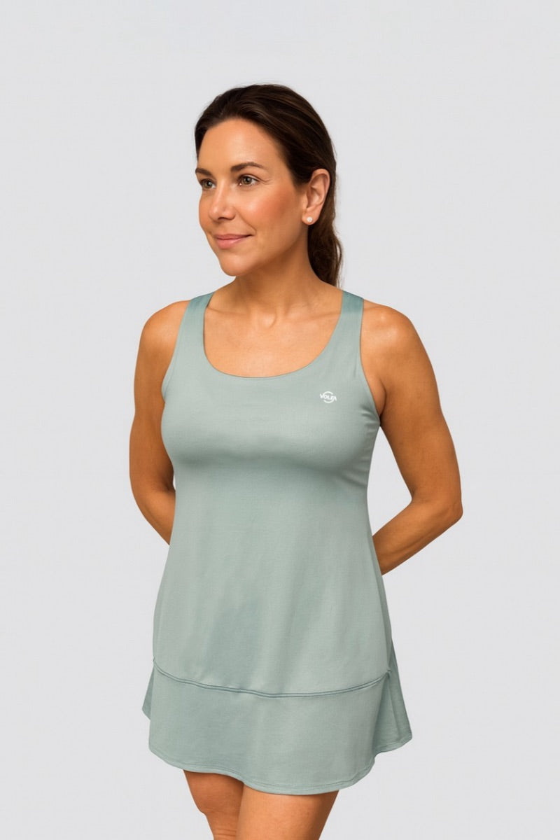 Vestido deportivo verde con tiras cruzadas en espalda, incluye un top interno que brinda soporte natural al busto. un diseño limpio y minimalista, confeccionado en tela liviana, fresca y de secado rápido. Cuenta con una costura horizontal que divide sutilmente la parte inferior de la falda dando inicio a una malla deportiva coordinada para darle un acabado más estructurado. Esta falda añade un ligero vuelo, un toque femenino y dinámico. Estilo básico y atemporal, ideal para jugar con comodidad sin perder elegancia. Incluye short con pretina alta y doble que ofrece agradable control al abdomen.