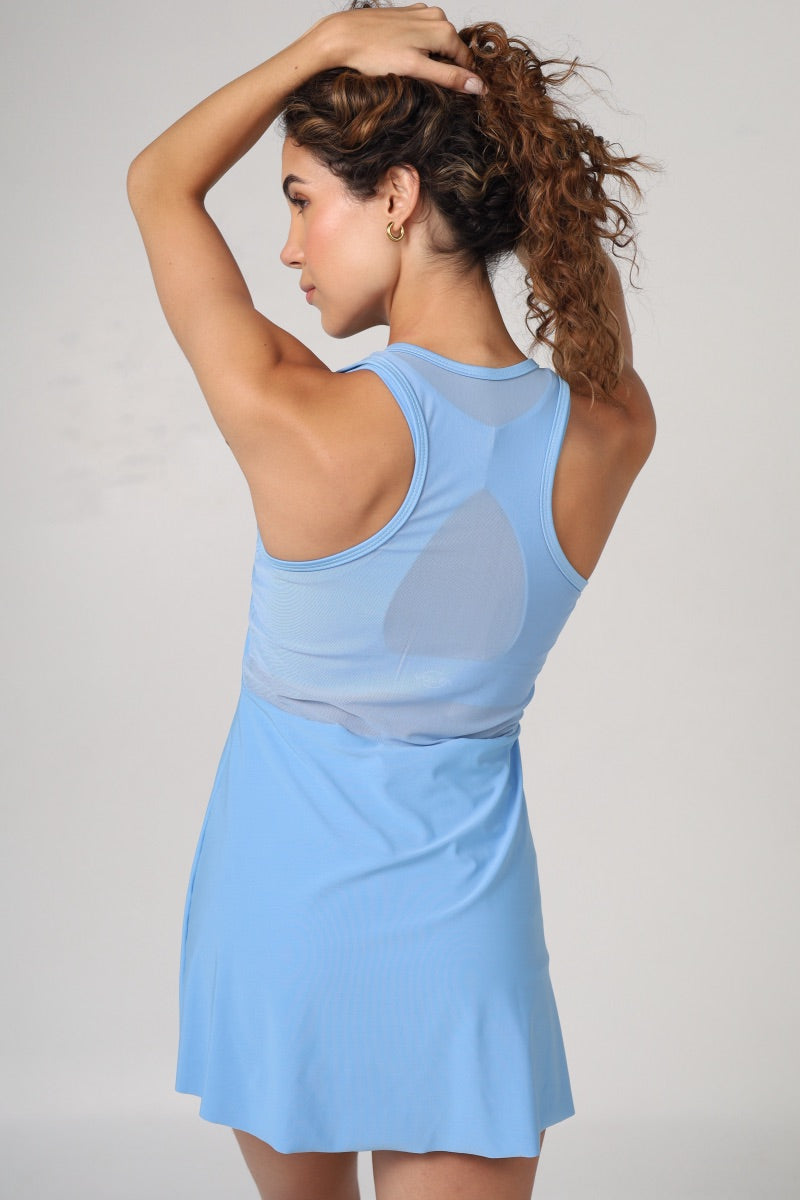 El color azul hortensia marca la diferencia fusionando estilo y rendimiento en 3 piezas que se complementan: short, top y vestido exterior. Todas en el mismo color y con el mismo textil de alto desempeño permiten sentir la comodidad y seguridad en el juego. Para control de abdomen se incluye el short de pretina alta y doble con ajuste perfecto que además lleva 2 bolsillos laterales. El vestido lleva una malla delantera y posterior que deja ver suavemente el diseño del top, mientras el tono azul hortencia aporta un aire delicado y elegante que resalta con cada movimiento.